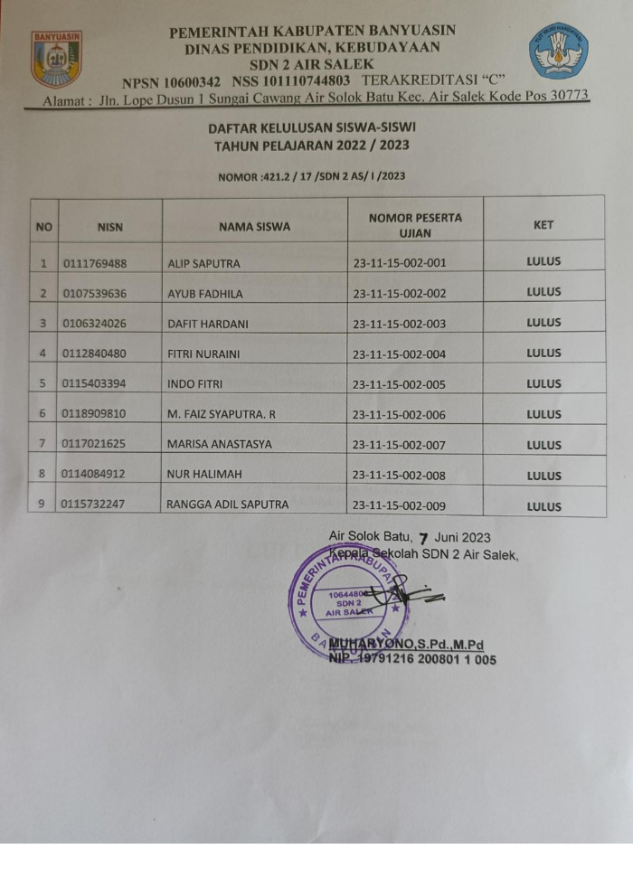 Pengumuman Kelulusan Siswa-siswi Kelas VI SDN 6 Air Salek